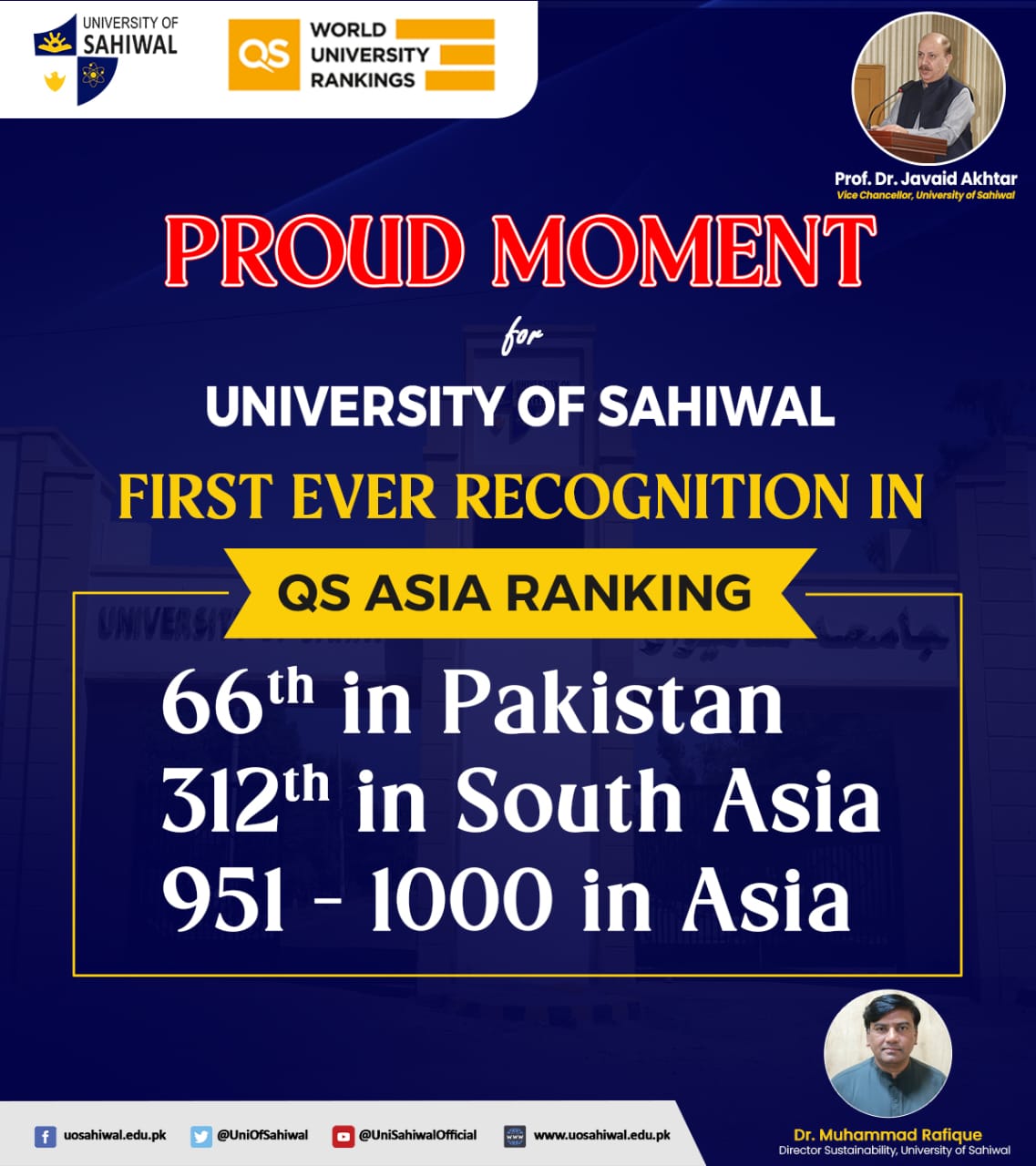 This recognition reflects the University’s unwavering commitment to quality education, impactful research, and institutional growth under the visionary leadership of Prof. Dr. Javaid Akhtar, Vice Chancellor, University of Sahiwal.