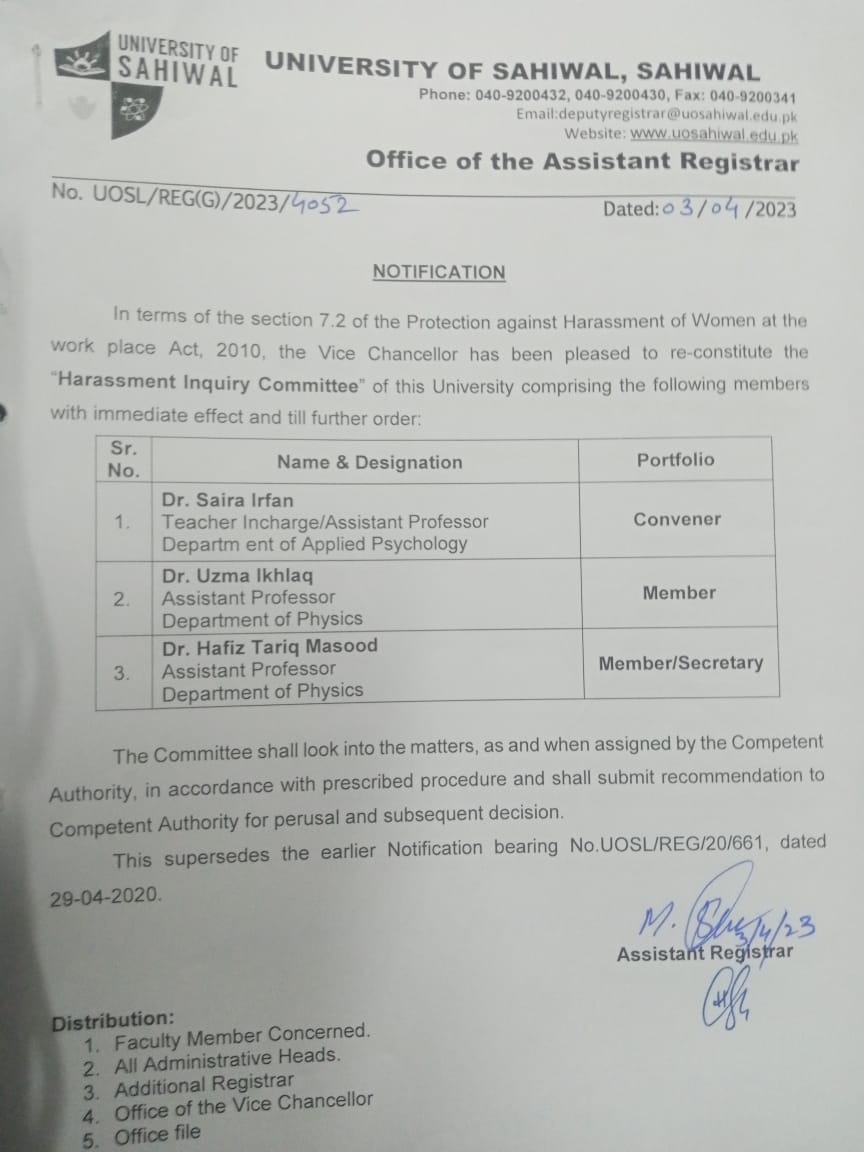 Inquiry Committee Against Workplace Harassment, University of Sahiwal.