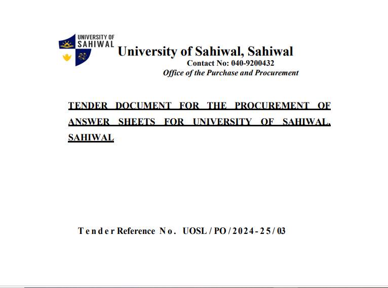 Tender document for the procurement of Answer Sheets for University of Sahiwal. Closing Time and Date: 11:00 am & 06.03.2025 Click Here to Download